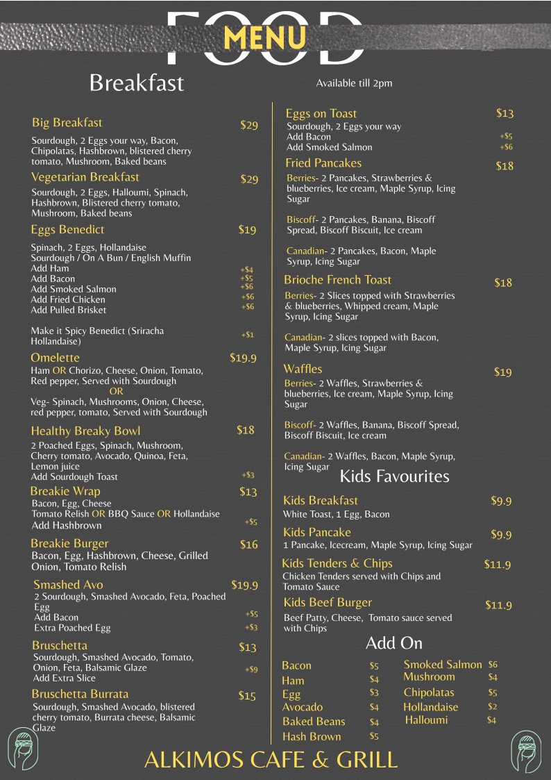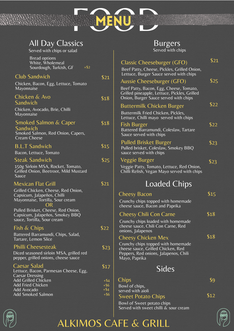 At Alkimos Cafe & Grill, you can indulge in a variety of scrumptious dishes that cater to every palate. Begin your day with their signature spicy eggs benedict or the hearty big brekky, both of which are brimming with fresh ingredients, ensuring every mouthful is a taste sensation. Don't forget to try out their standout buttermilk chicken burger—a crowd favorite that's been dubbed the best around! Customers rave about the generous portions and flavorful meals that not only satisfy but also delight with every bite.